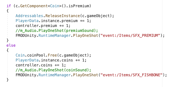 Dependiendo del tipo de objeto que recoge el player se lanza el sonido básico (SFX_FISHBONE) o el sonido Premium (SFX_PREMIUM)
