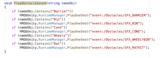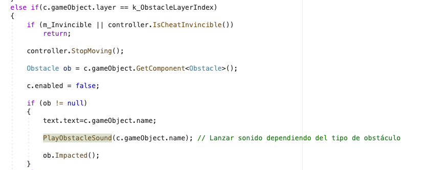 Además, en esta función también se encuentran las llamadas a FMOD para que ejecute el sonido de los obstáculos con los que choca. Para ello, se pregunta si el objeto con el que se ha colisionado, se encuentra dentro de la capa de obstáculos. Si es así, se llama a la función PlayObstacleSound que se encuentra dentro del mismo script del GameObject. Esta función la creo para reproducir el sonido específico dependiendo del objeto que ha colisionado. Recibe, por tanto, como parámetro este objeto colisionado.