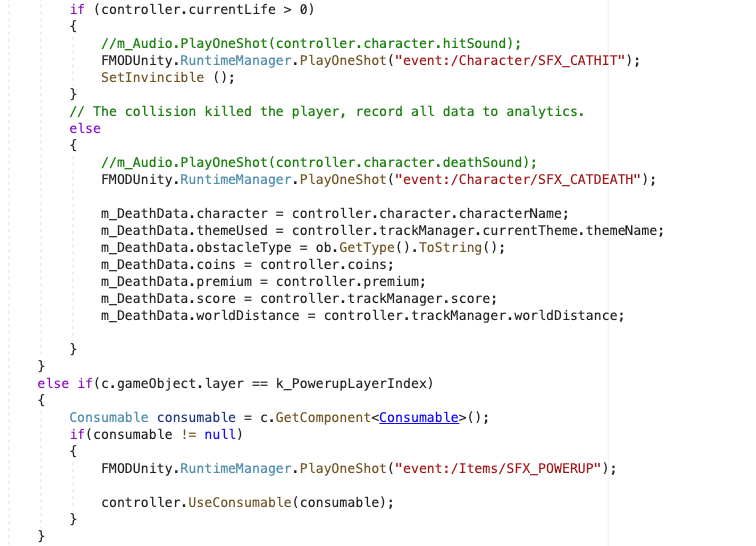 En la función OnTriggerEnter del Game Object del Jugador se lanzan los eventos de FMOD relacionados con los objetos que este recoge o con los que se choca.