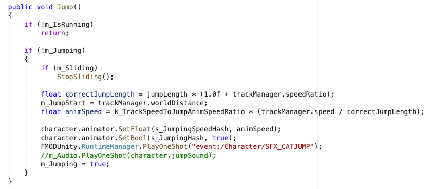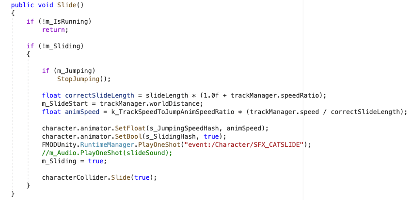 Son dos los movimientos: Saltar y Deslizarse. Cada uno de ellos tiene su propio método, desde donde se llama al evento en FMOD.