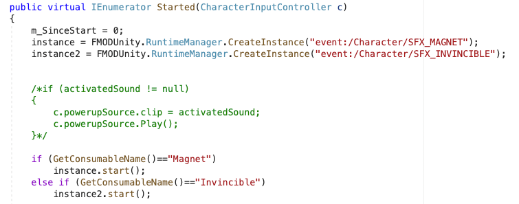 Dentro del juego hay dos momentos en los que dos sonidos suenan en loop. Cuando se recoge un imán que atrae todos los ítems y cuando se recoge una estrella que convierte al jugador en invencible. Para ello se utilizo la creación de instancias de FMOD dentro de la corrutina que maneja el tiempo en que estos ítems están activos.