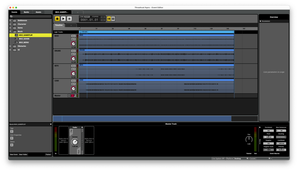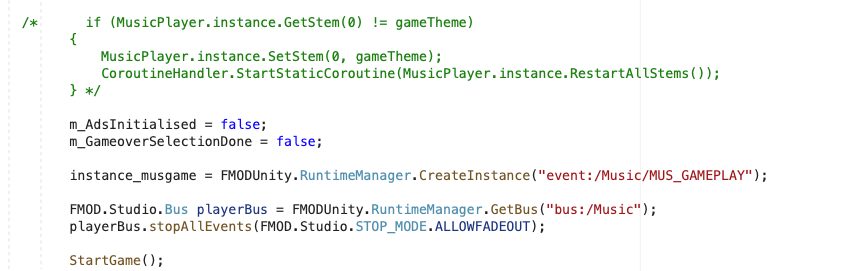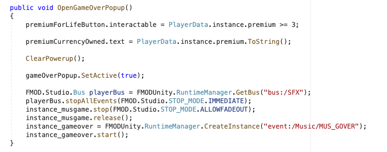 Por ejemplo, en la pantalla Game Over, se toma acceso al bus de FX de FMOD y se paran todos los eventos para que no se quede nada sonando. Además, hay que parar y liberar la instancia de la música del Gameplay y comenzar a ejecutar la música de Game Over.